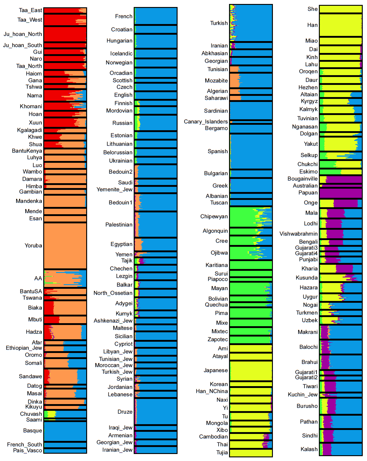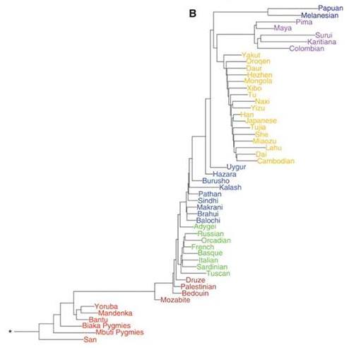 Qui abbiamo, invece, un’approfondita analisi genetica di varie popolazioni del mondo (Lazaridis et al. 2013-2014) che individua e distingue le componenti autosomiche razziali. Azzurro = caucasoide; giallo = mongoloide; arancione = congoide; rosso = capoide; viola = australoide; verde = amerindioide: