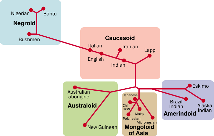 Stando agli studi pionieristici di Cavalli-Sforza, le popolazioni non africane sono più vicine tra loro rispetto agli africani subsahariani (congoidi e capoidi); gli europei sono imparentati con le altre genti caucasoidi di Nordafrica, Vicino e Medio Oriente e subcontinente indiano. I caucasoidi, e dunque gli europei, si collocano tra negroidi e mongoloidi, ma questo non significa che i “bianchi” siano il rimescolamento fra le altre due razze bensì, semplicemente, che l’uomo anatomicamente moderno nato in Eurasia occidentale tra i 60.000 e i 50.000 anni fa ha avuto contributi genetici africani e asiatici (che non vuol dire automaticamente negroidi e mongoloidi, parlando qui di migrazioni umane preistoriche e dunque di fenotipi arcaici), data la contiguità territoriale di Eurasia e Corno d’Africa, da cui il sapiens sarebbe uscito tra 150.000 e 100.000 anni fa.