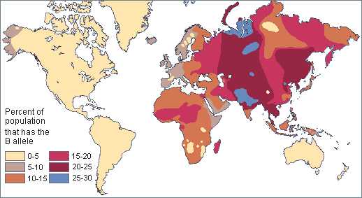 Il gruppo sanguigno B, infine, ha un aspetto molto asiatico, ma in Europa compare, con tutta probabilità, grazie agli invasori indoeuropei (che erano comunque, prevalentemente, A).